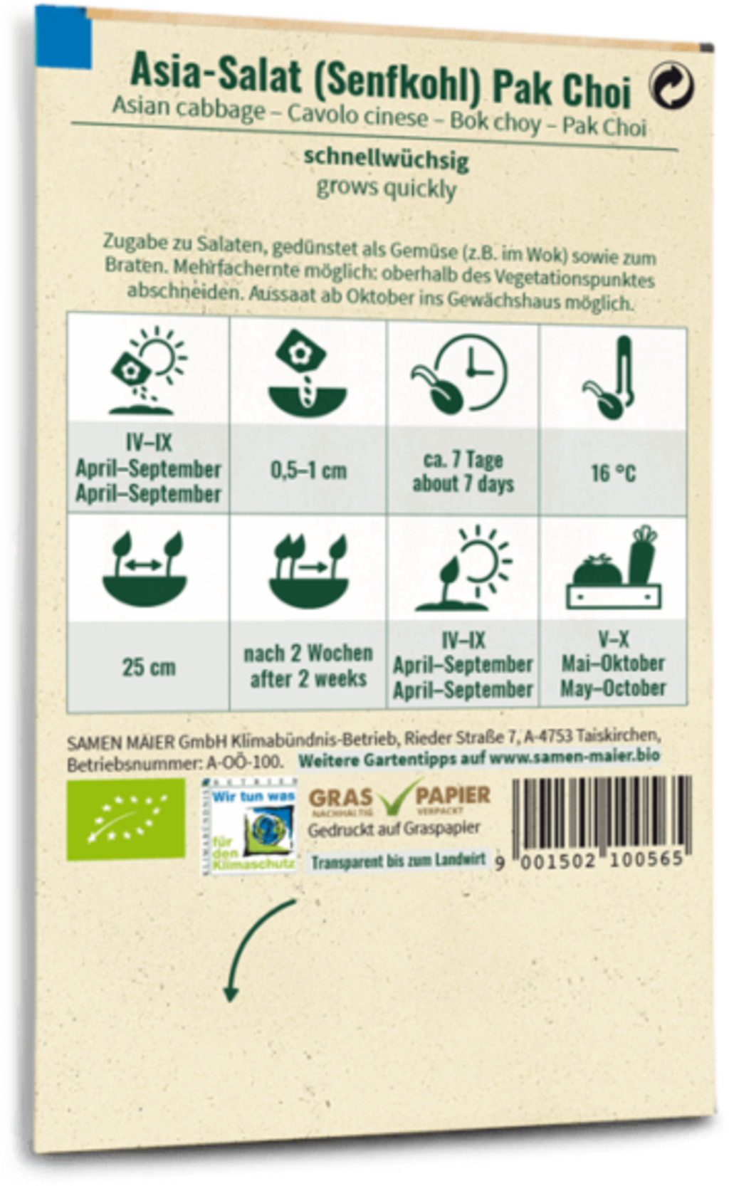 Dieser Pak Choi begeistert mit seinem leicht bitteren Geschmack und lässt sich ähnlich wie frischer Spinat und Mangold zubereiten. Er eignet sich für Salate, zum Dünsten im Wok und auch zum Braten. Dabei können sowohl die Blätter als auch die Stiele verwendet werden.