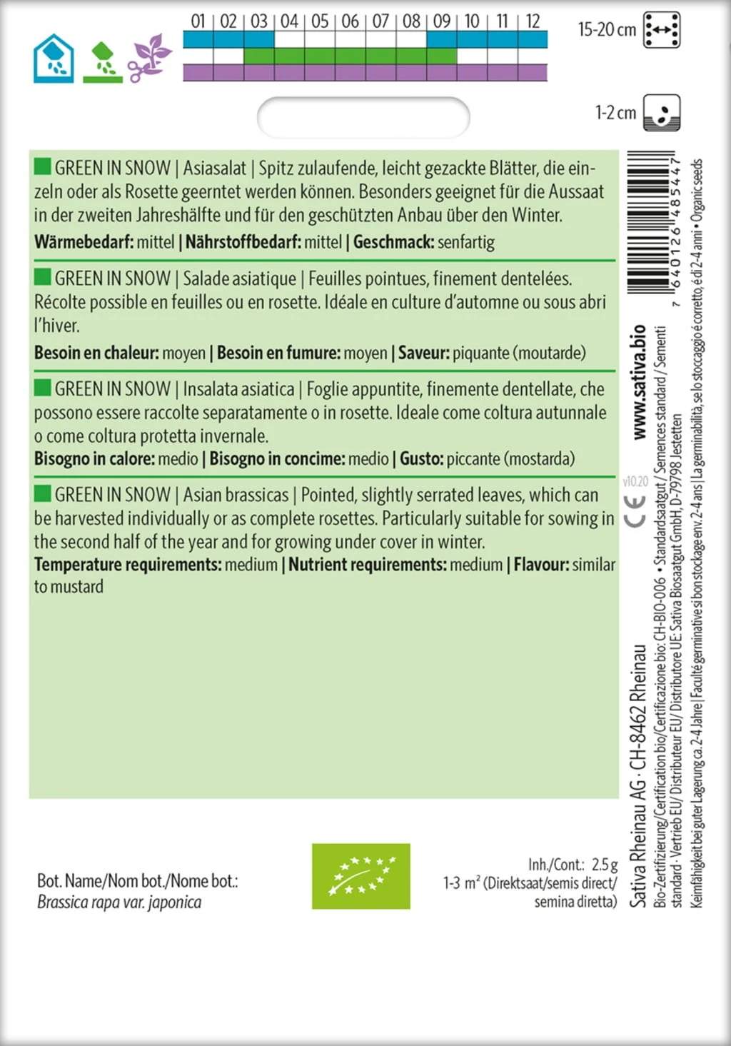 Dieser Asiasalat eignet sich besonders für den geschützten Anbau im Winter sowie für die Aussaat in der zweiten Jahreshälfte. Er bildet leicht gezackte, spitz zulaufende Blätter, die sowohl einzeln als auch als Rosette geerntet werden können und mit ihrem senfartigen Geschmack begeistern.