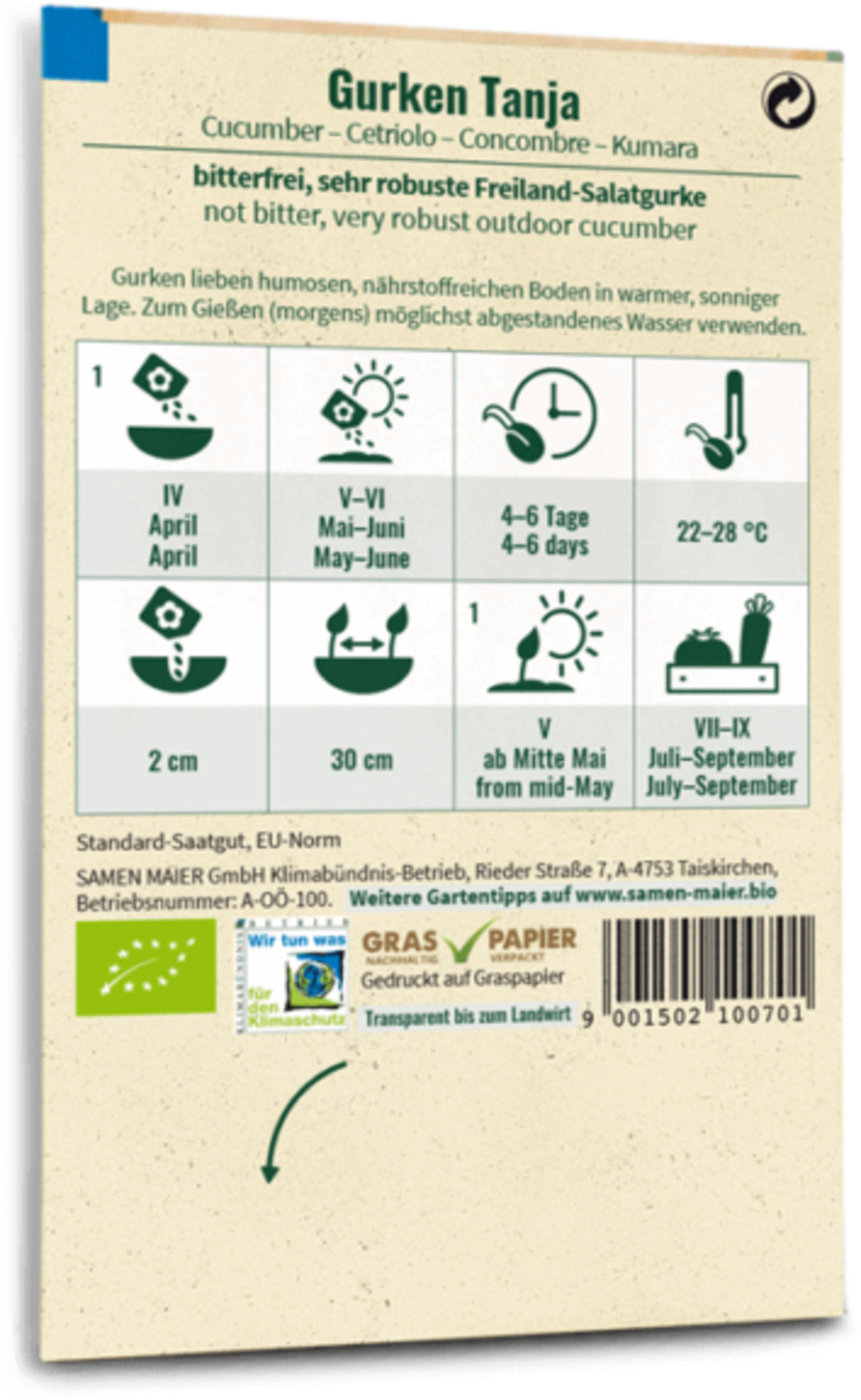 Diese sehr robuste Freiland-Gurke begeistert mit ihrem bitterfreien Geschmack, mit dem sie die perfekte Zutat zu köstlich-frischen Sommersalaten ist. Sie bevorzugt einen lockeren, humosen Boden sowie einen sonnigen Standort und sollte keinesfalls pikiert und auch nicht zu früh in Töpfen ausgesät werden. Am besten wird sie nach den Eisheiligen und wenn sich zwei echte Blätter gebildet haben ausgepflanzt.