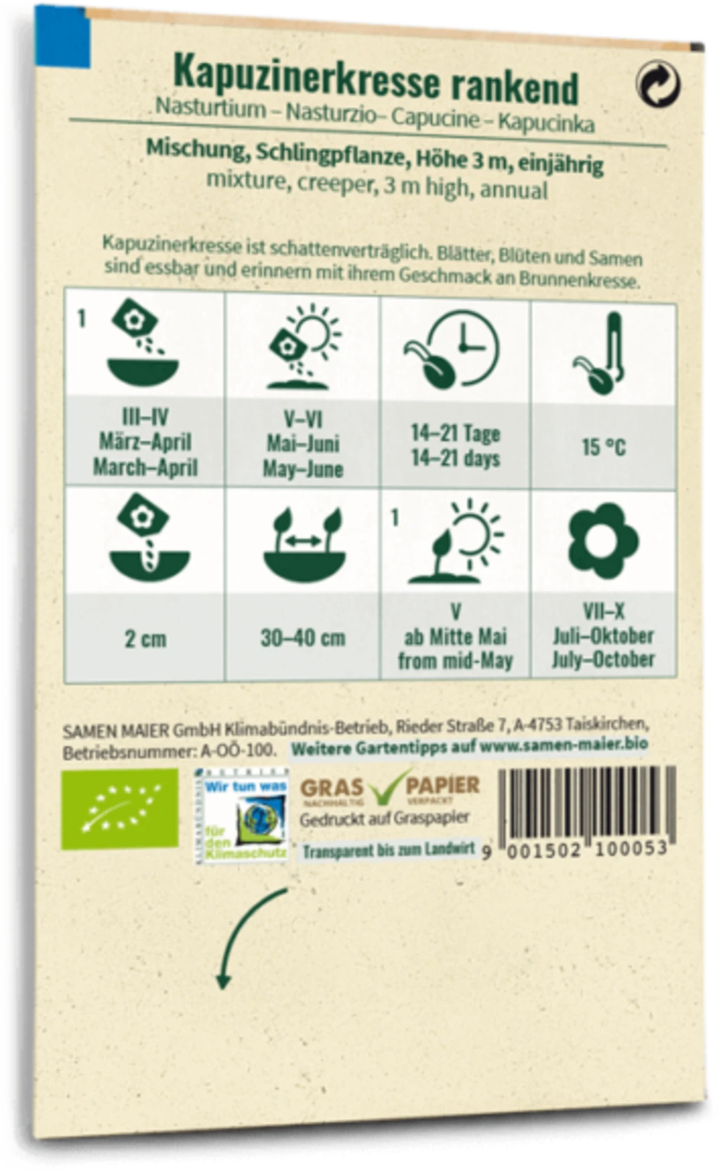 Kapuzinerkresse bevorzugt magere, trockene Böden in sonniger bis halbschattiger Lage. Während der Keimzeit feucht halten.