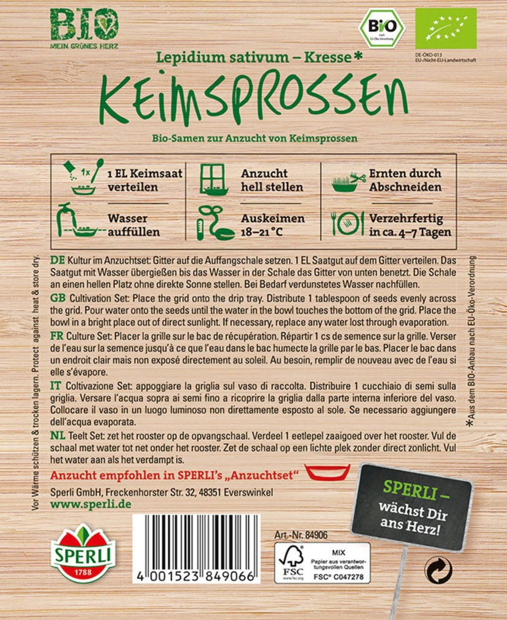 Die Keimsprossen “Kresse” haben einen hohen Anteil an ätherischen Ölen und Bitterstoffen. Die darin enthaltenen Vitamine sind optimal für eine gesunde Ernährung. Die Kresse ist als Würz- und Heilmittel bekannt und seit jeher eine beliebte Delikatesse. Eine ideale Ergänzung zu Quarkspeisen, Salaten und Butterbroten.