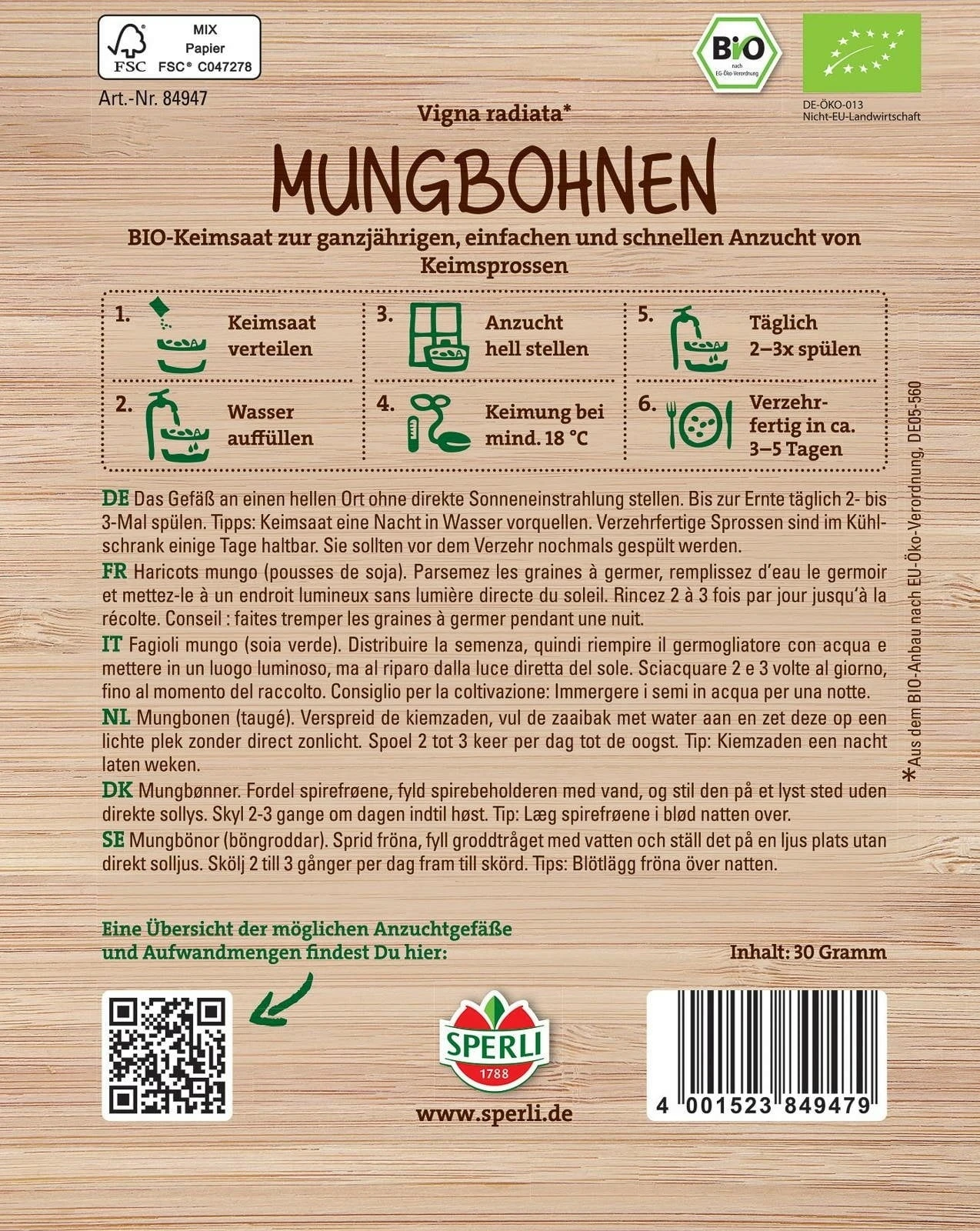 Die Keimsprossen “Mungbohnen” haben einen leicht süßlichen, nussartigen Geschmack. Sie enthalten viele wichtige Vitamine und Mineralstoffe. Die Sprossen sind kalorienarm und können auch roh verzehrt werden. Hervorragend für süße und salzige Speisen geeignet.