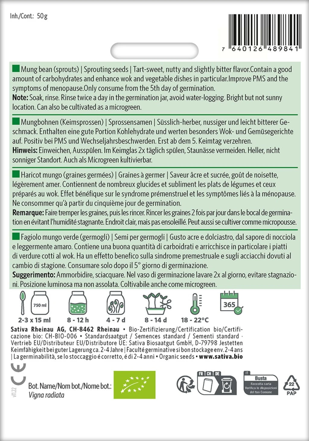 Mungobohnen Keimsprossen besitzen ein süßlich-herbes Aroma. Ihr Geschmack ist nussig und leicht bitter. Sie harmonieren wunderbar mit Wok- und Gemüsegerichten. Verzehrt werden sollten die Sprossen erst ab dem 5. Keimtag. Auch eine Kultivierung als Microgreens ist möglich.