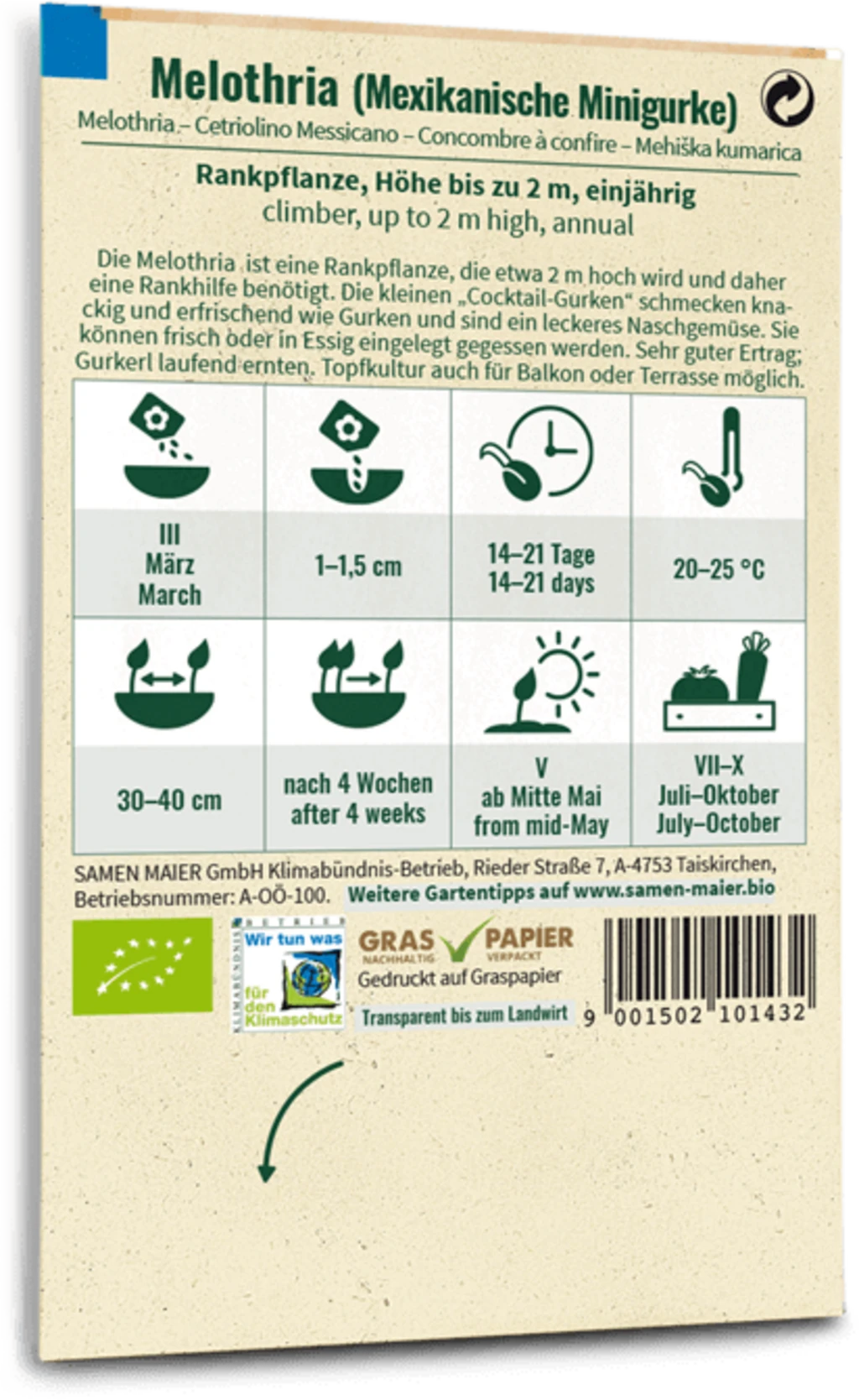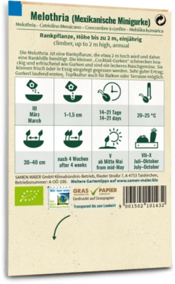 Die kleinen Gurken dieser Pflanze sind mit ihrem erfrischenden Geschmack ein köstliches Naschgemüse. Darüber hinaus eignen sie sich auch perfekt zum Einlegen in Essig. Die Pflanze ist sehr ertragreich, sodass du laufend kleine Gurkerln ernten kannst. In Töpfen kannst du sie auch auf Balkon und Terrasse züchten. Da sie bis zu 2 m hoch wird, benötigt sie jedoch eine Rankhilfe.