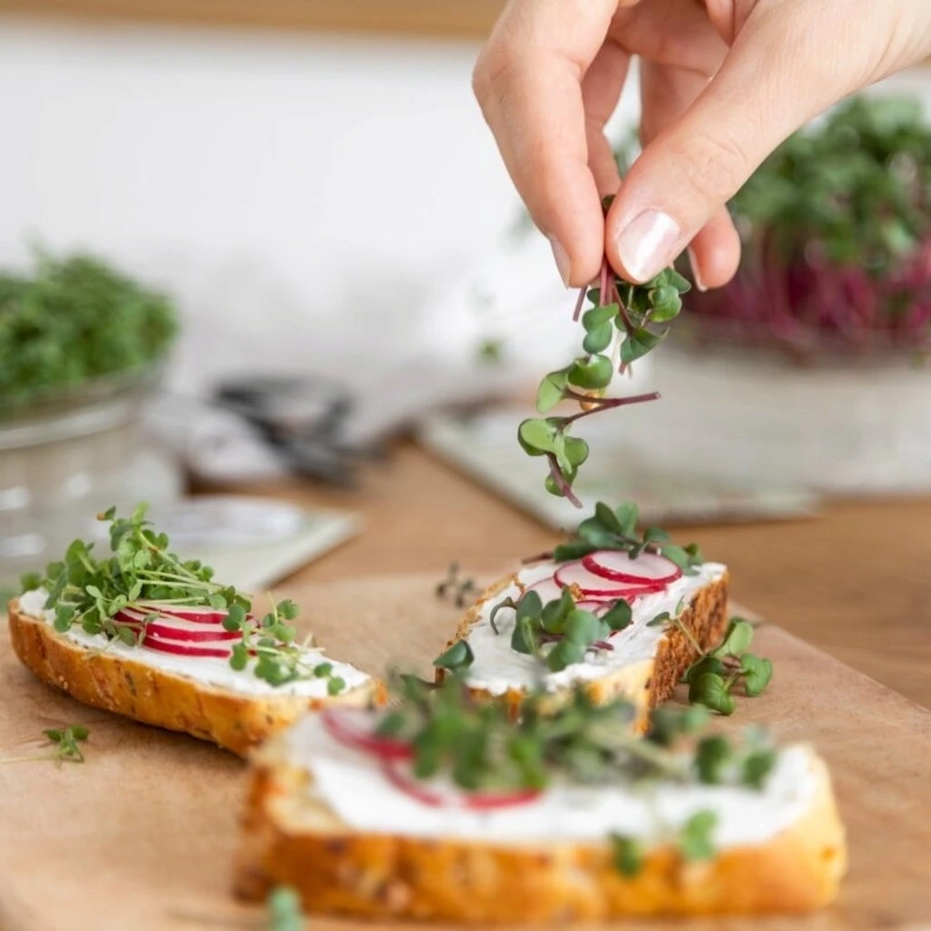 Gartenkresse, Alfalfa Sprossen, WeiĂer Senf, Daikon Rettich, Rucola, Brokkoletti (Ur-Brokkoli), Japanischer Senfkohl (Mizuna Red), Radies (China Rose)