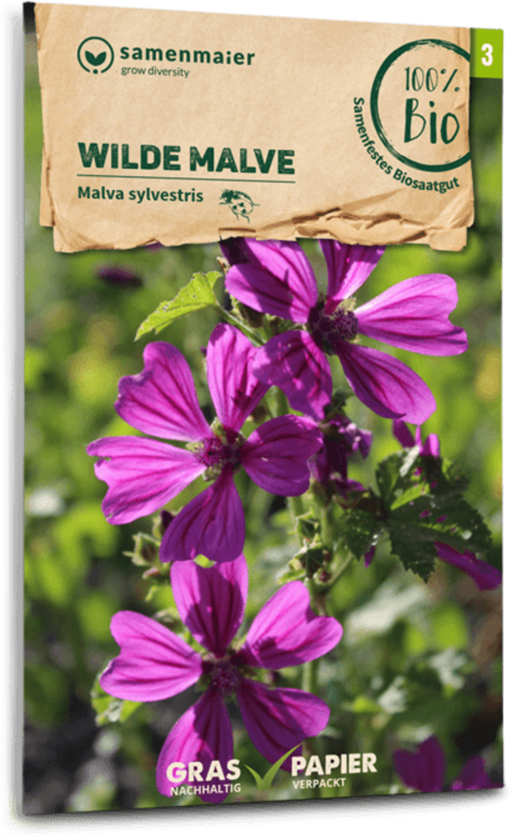 Wildblumen von Samen Maier sind in Graspapier verpackt. Dieses wird ohne den Einsatz von Chemikalien und mit deutlich weniger Energie- sowie Wasserverbrauch aus dem schnell nachwachsenden Rohstoff Gras hergestellt. So ist es ein nachhaltiges und besonders umweltfreundliches Verpackungsmaterial.
