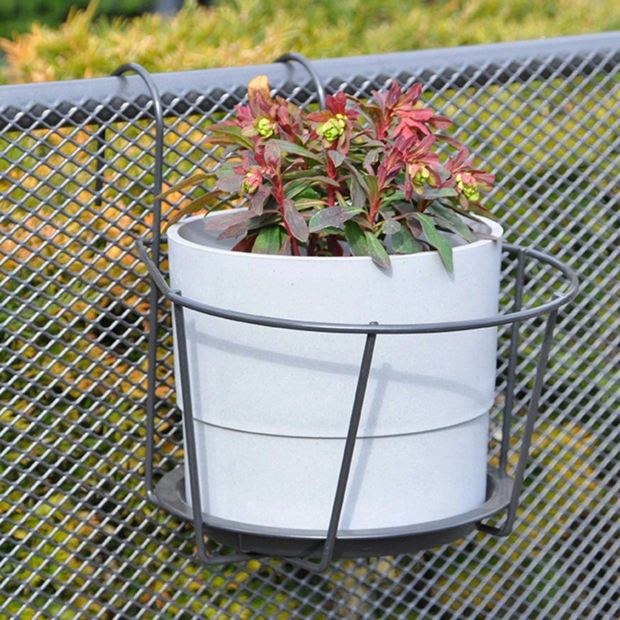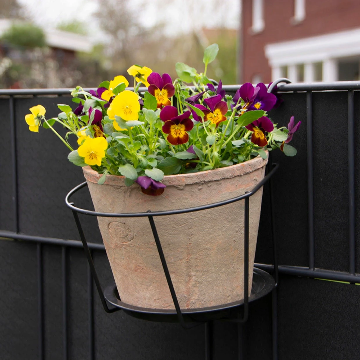 Mit dem Balkonblumentopfhänger von Esschert Design kannst du deine Blumentöpfe einfach und schick in einen Hängetopf verwandeln. Die Vorrichtung aus stabilem und langlebigem Eisen lässt sich schnell und einfach auf das Geländer deines Balkons hängen, verschönert aber auch Zäune und Absturzsicherungen.