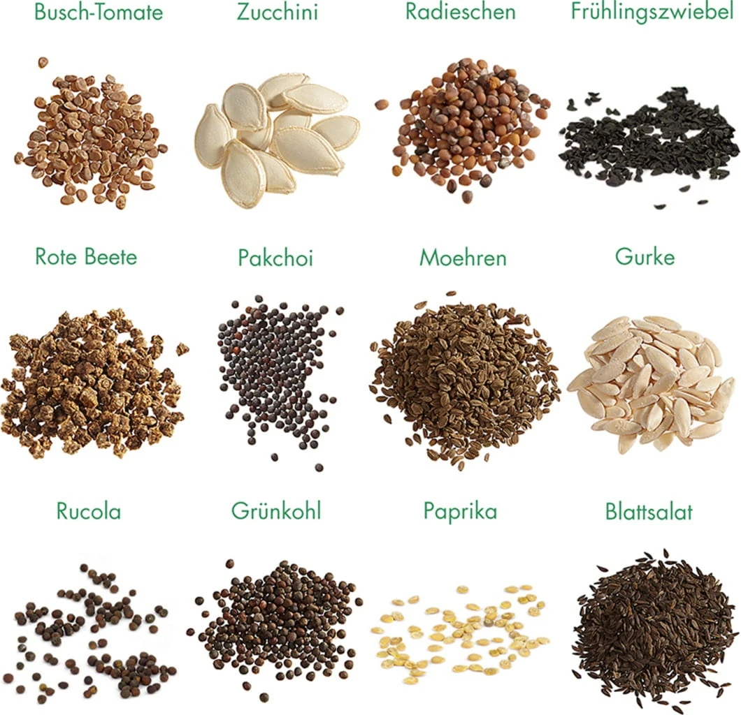 Gurke, Busch-Tomate, Möhre, Radieschen, Schnittsalat, Zucchini, GrĂŒnkohl, Pak Choi, FrĂŒhlingszwiebel, Rucola, Paprika, Rote Beete