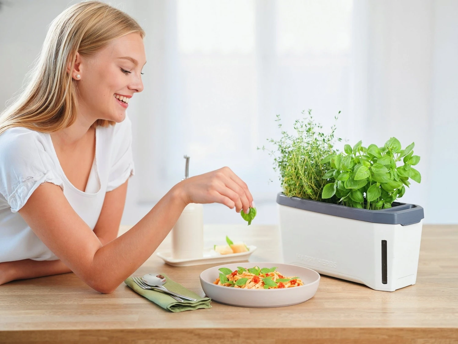 Dank Hydroponik gelingt die Anzucht in diesem Kräutertopf auch ganz ohne Erde – frische Luft und klares Wasser reichen völlig aus.