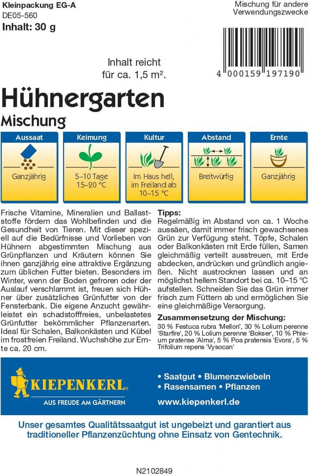 Frisches grünes Futter wird von Hühnern sehr geliebt. Diese Mischung enthält spezielle Grünpflanzen und Kräuter, die den Speiseplan der Federtiere mit vielen frischen Vitaminen, Mineralien und Ballaststoffen aufpeppen. Die Anzucht und Ernte ist im frostfreien Freiland ganzjährig möglich.