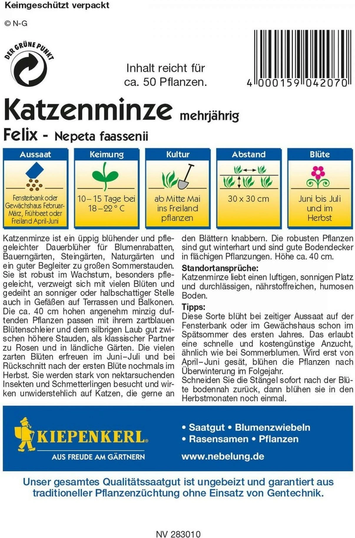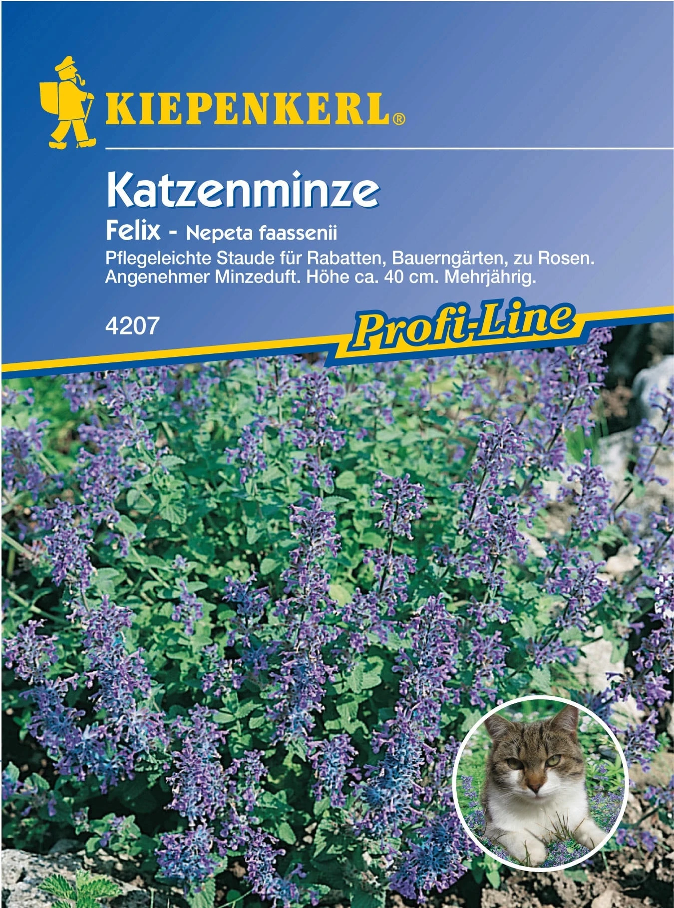 Der ideale Dauerblüher für Blumenrabatten, Bauerngärten, Steingärten und Naturgärten. Besonders pflegeleicht und sehr robust im Wachstum. Gedeiht an sonnigen oder halbschattigen Stellen. Die minzig duftende Pflanze eignet sich auch für Gefäße auf Terrassen und Balkonen. Die zartblauen Blüten erfreuen im Juni-Juli und bei Rückschnitt nach der ersten Blüte nochmals im Herbst. Die Katzenminze wird gerne von Insekten und Schmetterlingen besucht. Katzen lieben diese Pflanze und knabbern gerne an den Blättern.