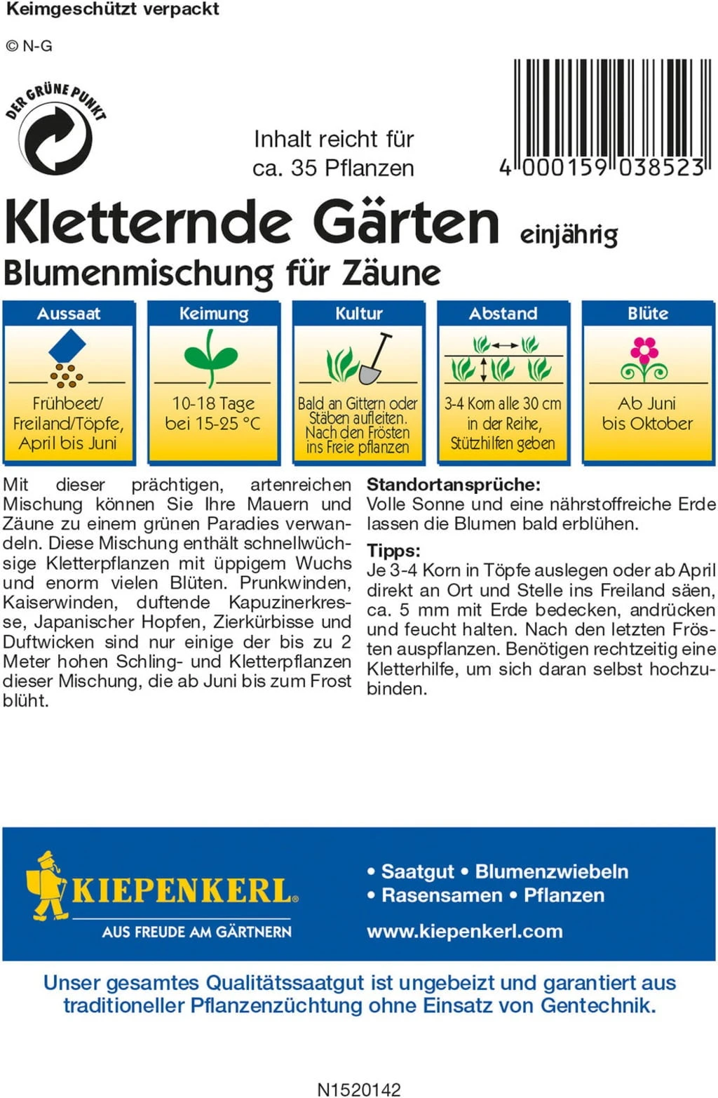 Eine attraktive Mischung beliebter buntblühender Schling- und Kletterpflanzen zum Beranken von Zäunen , Spalieren und Wänden. Die Mischung enthält z.B. Wicken, Kapuzinerkresse, Trichterwinden, Kaiserwinden, Zierkürbissesse.