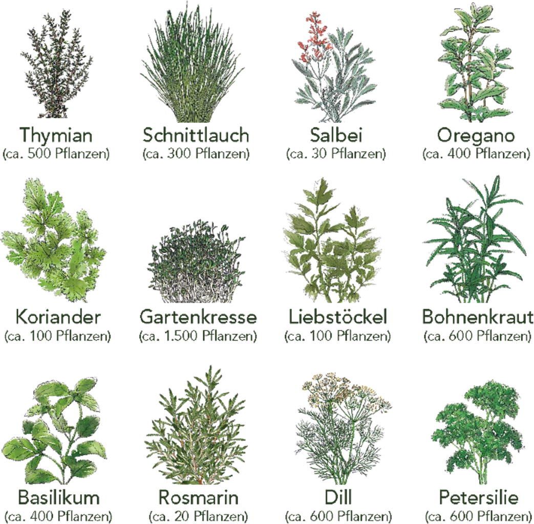 Basilikum, Schnittlauch, Dill, Koriander, Gartenkresse, Petersilie, Thymian, Salbei, Rosmarin, Oregano, Bohnenkraut, Liebstöckel