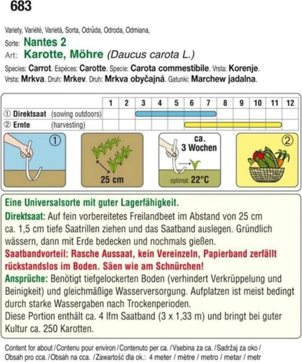 Das Saatband benötigt einen tiefgelockerten Boden und gleichmäßige Wasserversorgung. Diese Portion enthält ca. 4 lfm Saatband (3 x 1,33 m) und bringt bei guter Kultur ca. 250 Karotten.