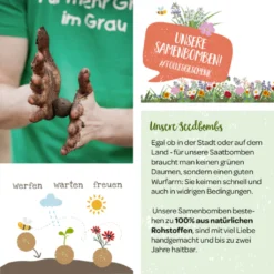 Wer einen kräftigen Wurfarm besitzt, wird seine helle Freude haben! Mit über 25 blühenden Wildblumenarten sorgst du an der Landestelle für einen bunt blühenden Farbtupfer. Enthalten sind Saatgutarten wie z.B. Adonisröschen, Steinkraut, Duftsteinrich, Kornblumen und viele mehr!