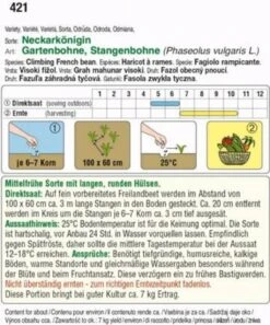 Eine ertragreiche Sorte mit langen, geraden, fadenlosen Hülsen, die bis zu 28 cm lang werden können. Die Bohnen besitzen eine weiße Farbe. Beliebt als Salat, Beilage oder in Suppen und Eintöpfen.