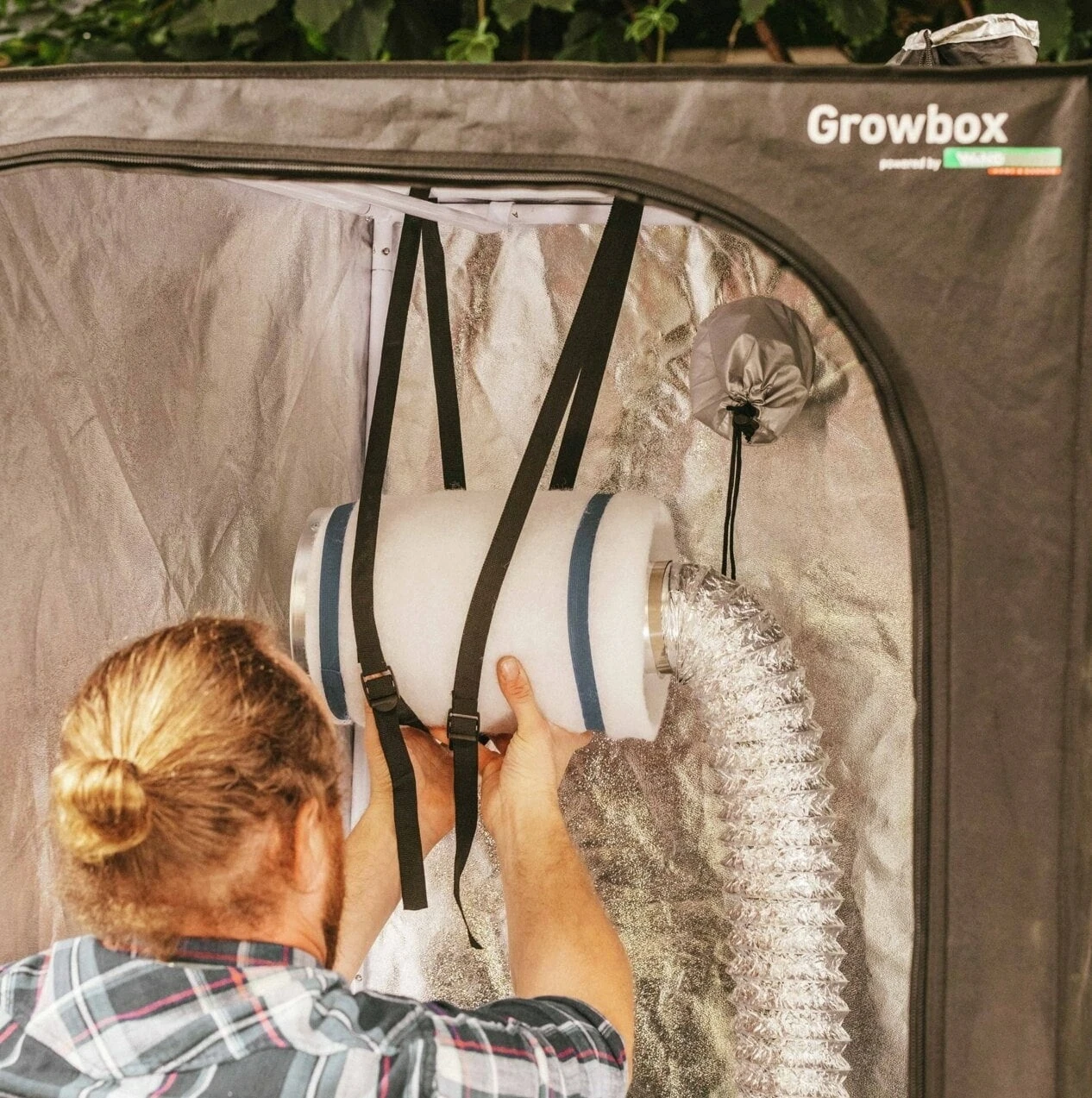 Die Fixierung des Aktivkohlefilters im Inneren der Growbox erfolgt mittels verstellbarer Halteriemen. Er wird mit dem 5 m langen Abluftschlauch verbunden und auĂźerhalb der Growbox wird ein Rohrventilator mit einem Luftdurchsatz von 170 m3 pro Stunde angeschlossen.