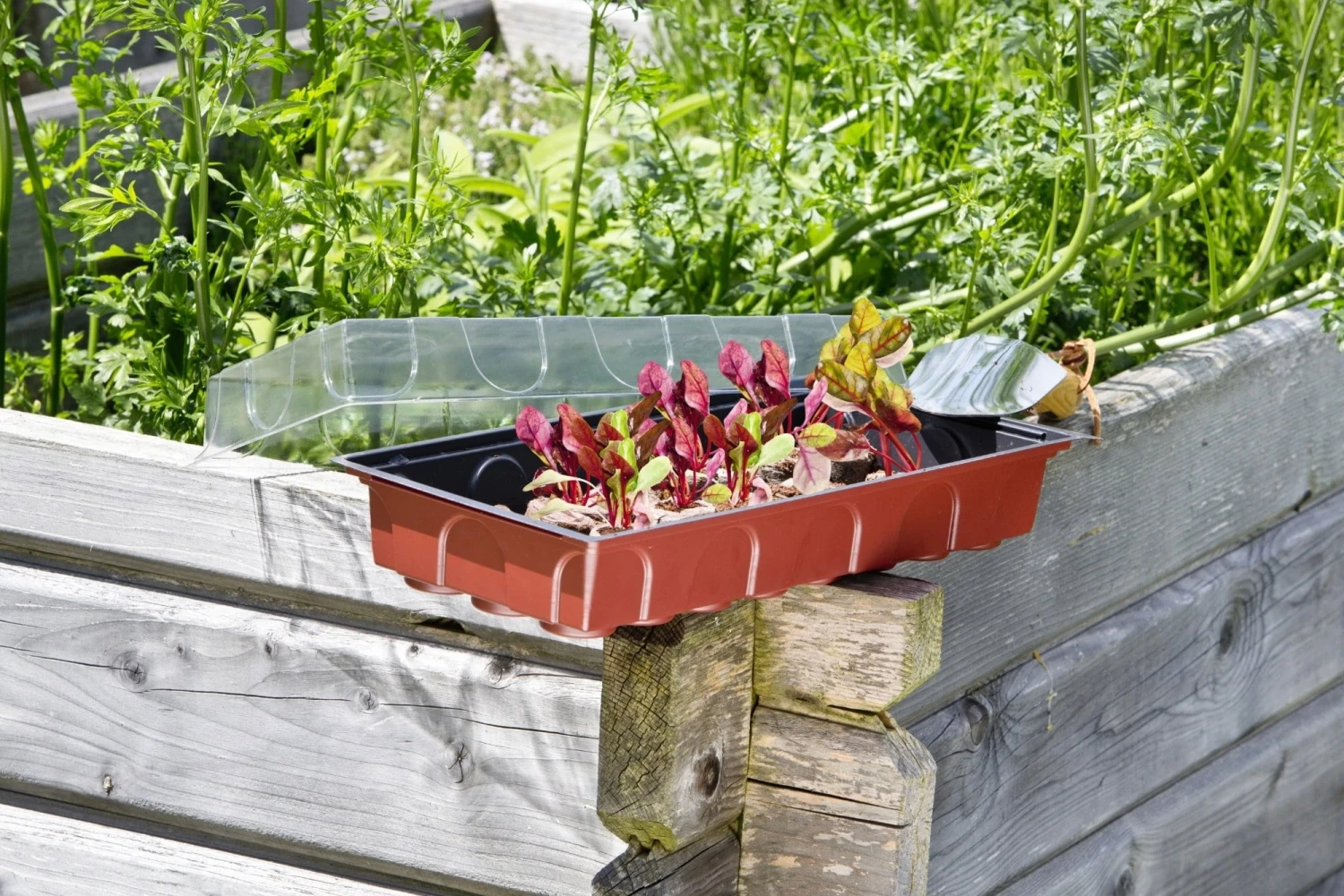 Die terracotta-farbige, robuste Kunststoffschale mit Klarsichthaube sorgt für ein Treibhausklima in dem Keimlinge zeitiger und besser gedeihen, mit oder ohne Anzucht-Quelltabs.