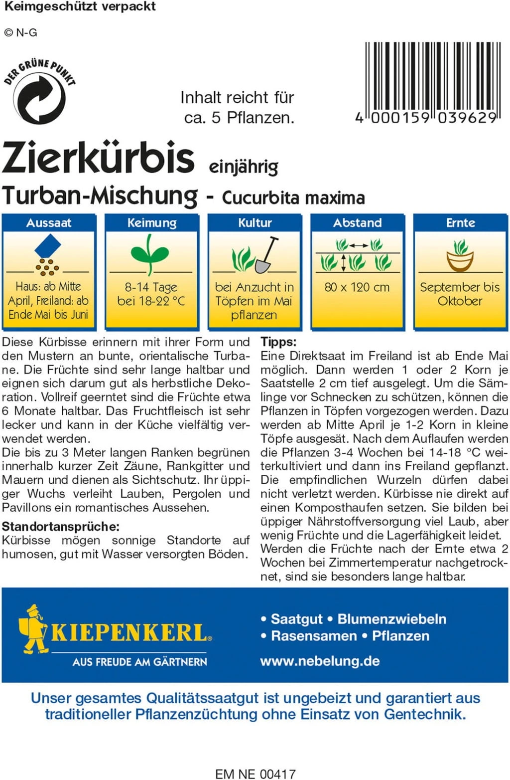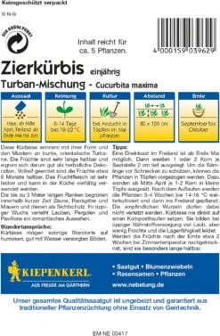 Dekorative Kürbisse in exotischen Formen und bunten Farben. Sehr lange haltbar. Rankend, einjährig. Die interessanten exotischen Formen der Turbankürbisse erfreuen immer häufiger Jung und Alt. Ihre Farben sind auffällig und ungewöhnlich – gerade richtig für herbstliche Dekorationen, als Raumschmuck, zum Basteln und als witziges, ungewöhnliches Geschenk. Turbankürbisse halten oft länger als ein halbes Jahr. Die bis zu 3 Meter langen Ranken begrünen innerhalb kurzer Zeit Zäune, Rankgitter und Mauern und dienen als Sichtschutz. Ihr üppiger Wuchs verleiht Lauben, Pergolen und Pavillons ein romantisches Aussehen.