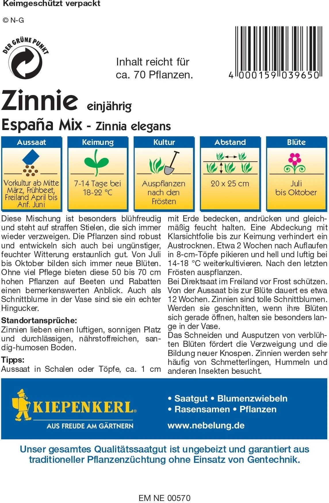 Espana-Mix‘ gefällt durch ein wunderschönes Farbspiel in warmen orange, gelb und rot. Diese Mischung ist besonders blühfreudig und steht auf straffen Stielen, die sich immer wieder verzweigen. Die Pflanzen sind viel robuster als frühere Sorten und entwickeln sich auch bei ungünstiger feuchter Witterung erstaunlich gut. Freundliche Farben erfreuen sehr lange von Juli bis Oktober. Ohne viel Pflege bieten diese Zinnien auf Beeten und Rabatten einen überwältigenden Anblick und bieten viele lange haltbare Schnittblumen für die Vase.