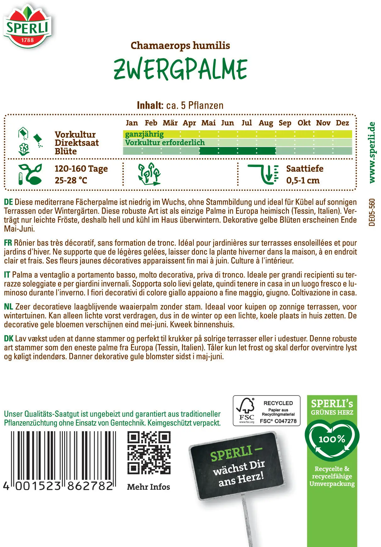 Die einzig in Europa heimische Palme aus dem Mittelmeerraum, sehr widerstandsfähig. Im Weinbauklima und besonders geschützten Lage bedingt winterhart, verträgt einige Grade Frost.